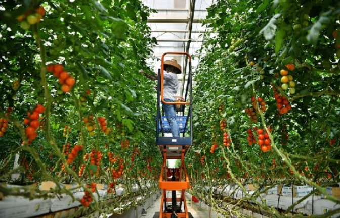 在海南省陵水現(xiàn)代農(nóng)業(yè)示范基地,工人在管理通過擱架吊蔓式栽培技術種植的詹妮瑞番茄。新華社記者 郭程 攝