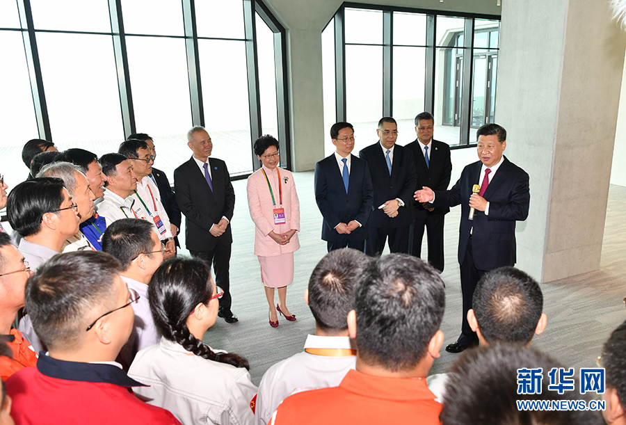 東人工島位于港珠澳大橋水上橋梁和水下隧道的銜接部分,是大橋建設(shè)中的關(guān)鍵節(jié)點(diǎn)工程。習(xí)近平等乘車來(lái)到這里,登上西側(cè)平臺(tái)眺望大橋,結(jié)合圖片、模型詳細(xì)了解大橋建設(shè)情況,并會(huì)見(jiàn)了大橋管理和施工等方面的代表,同他們一一握手、親切交談。他指出,港珠澳大橋是國(guó)家工程、國(guó)之重器。你們參與了大橋的設(shè)計(jì)、建設(shè)、運(yùn)維,發(fā)揮聰明才智,克服了許多世界級(jí)難題,集成了世界上最先進(jìn)的管理技術(shù)和經(jīng)驗(yàn),保質(zhì)保量完成了任務(wù),我為你們的成就感到自豪,希望你們重整行裝再出發(fā),繼續(xù)攀登新的高峰。