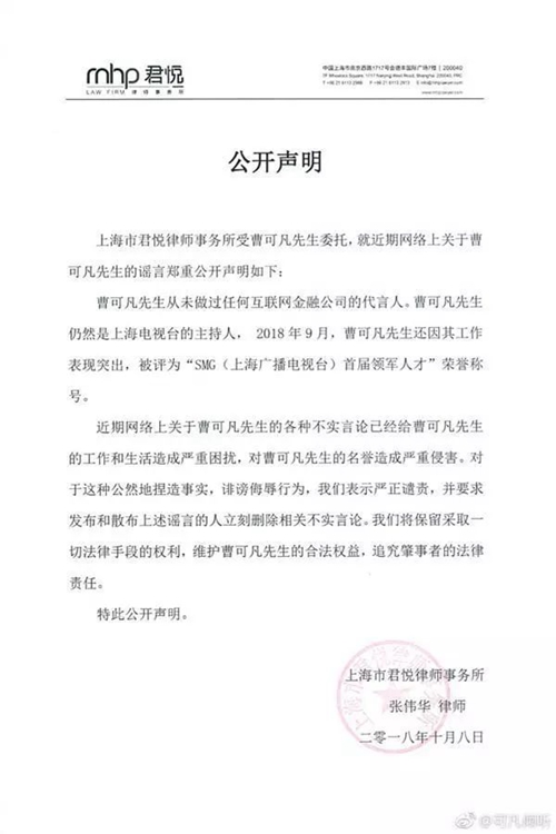 但事實(shí)上,主持人曹可凡國慶節(jié)前后多次參加公眾活動(dòng),國慶期間也曾發(fā)布過微博。但這些都沒能有效阻止謠言傳播,最終還是靠曹可凡本人委托的一封律師函,方才真相大白。