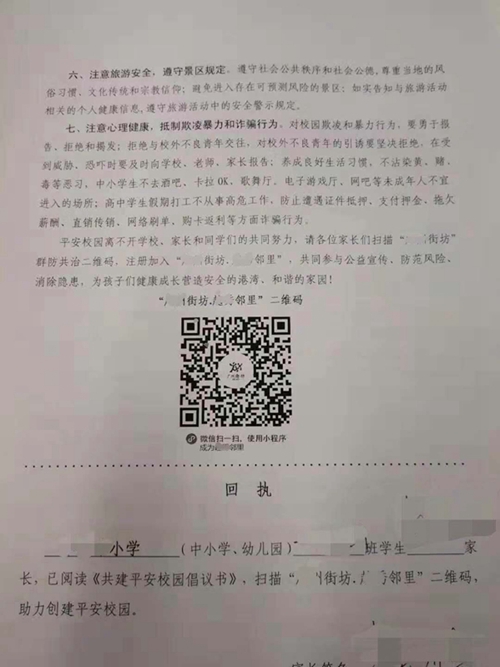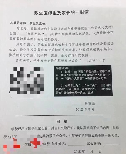 前不久,廣東某地發(fā)起“街坊群防共治隊(duì)伍建設(shè)”,并開設(shè)了微信公眾號。當(dāng)?shù)亟逃忠浴吨氯珔^(qū)師生及家長的一封信》的形式,要求師生和家長關(guān)注其公眾號,并要求學(xué)生及家長簽名承諾“關(guān)注”。