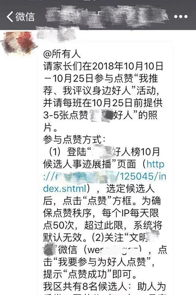 近日,廣東某所幼兒園的家長們又在群里收到老師發(fā)的通知:“請家長們在2018年10月10日-10月25日參與點(diǎn)贊‘我推薦、我評議身邊好人’活動,并請每班在10月25日前提供3-5張點(diǎn)贊的照片。”