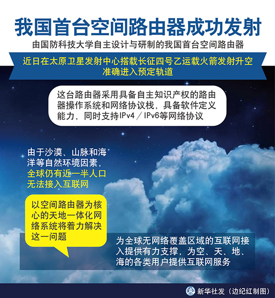 新華社長沙10月29日電(趙寶康、劉于藍)由國防科技大學自主設計與研制的我國首臺空間路由器,近日在太原衛(wèi)星發(fā)射中心搭載長征四號乙運載火箭發(fā)射升空,準確進入預定軌道。