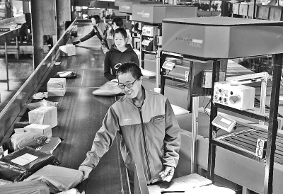11月11日,工作人員在江蘇省南通市一家快遞公司分揀系統(tǒng)旁忙碌。國家郵政局預(yù)計(jì),今年“雙11”期間,全行業(yè)處理的郵件、快件業(yè)務(wù)量有望超過18.7億件,最高日處理量是平日的3倍。新華社發(fā)(許叢軍攝)