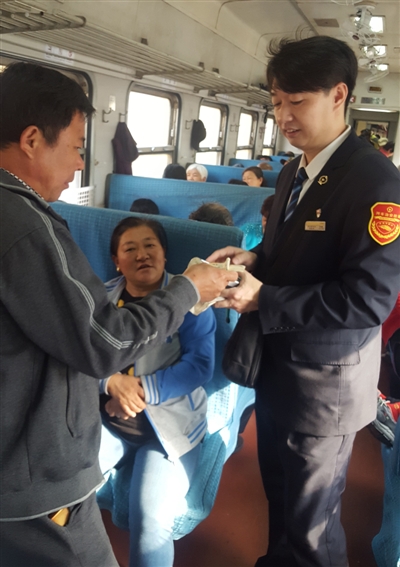 目前,除了四個大站提供售票服務外,7053次經(jīng)過的其他20個小站都是上車補票。圖為列車員正在為乘客補票。