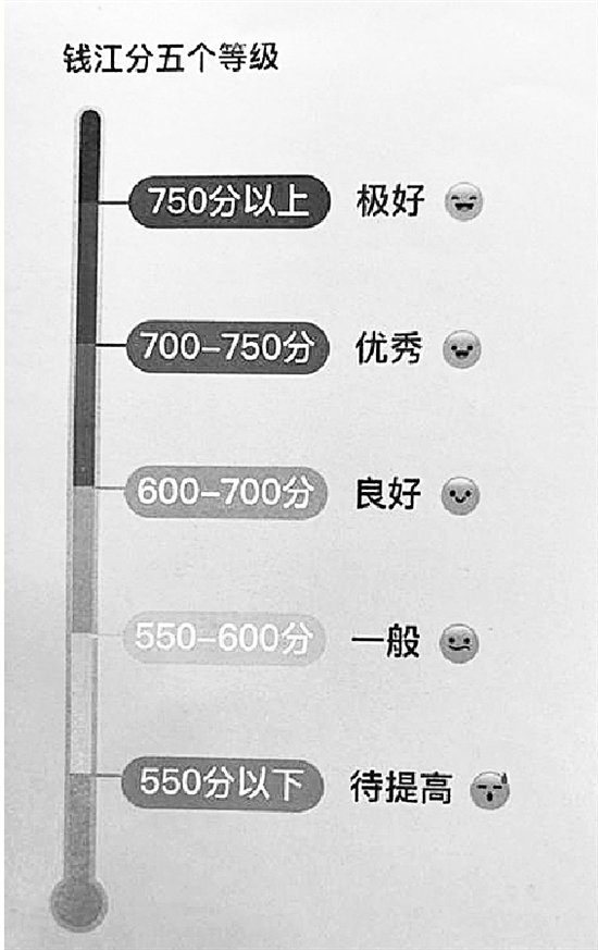 “錢江分”采用千分制,共分5個(gè)等級(jí):當(dāng)用戶分?jǐn)?shù)低于550分,信用待提高;550~600分信用一般;600~700分信用良好;700~750信用優(yōu)秀;750分以上用戶信用極好。
