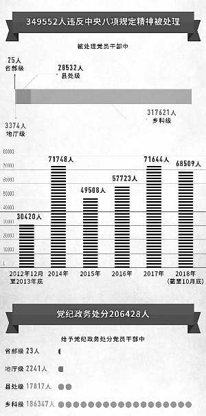 六年來,中央紀(jì)委國(guó)家監(jiān)委和各級(jí)紀(jì)檢監(jiān)察機(jī)關(guān)以釘釘子精神打好作風(fēng)建設(shè)持久戰(zhàn),一個(gè)節(jié)點(diǎn)一個(gè)節(jié)點(diǎn)堅(jiān)守,一個(gè)問題一個(gè)問題解決,盯緊盯牢、持之以恒,一刻不停歇地推動(dòng)作風(fēng)建設(shè)向縱深發(fā)展,以實(shí)際成效將“金色名片”越擦越亮。截至2018年10月底,全國(guó)累計(jì)查處違反中央八項(xiàng)規(guī)定精神問題254808起,處理349552人,給予黨紀(jì)政務(wù)處分206428人。