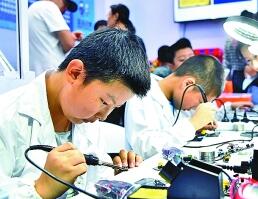 2018世界機器人大會上,小學生在焊接用于編程的模塊。新華社發(fā)