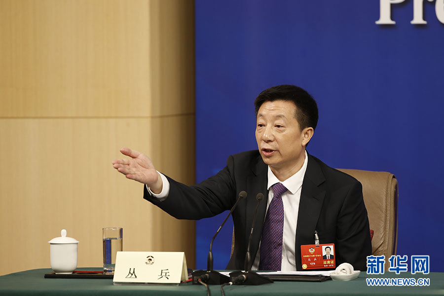 3月10日8時(shí)45分,全國政協(xié)十三屆一次會(huì)議在梅地亞中心多功能廳舉行記者會(huì),邀請(qǐng)5位全國政協(xié)委員就“提高保障和改善民生水平”回答記者提問。圖為記者會(huì)主持人叢兵。新華網(wǎng)/中國政府網(wǎng) 翟子赫 攝