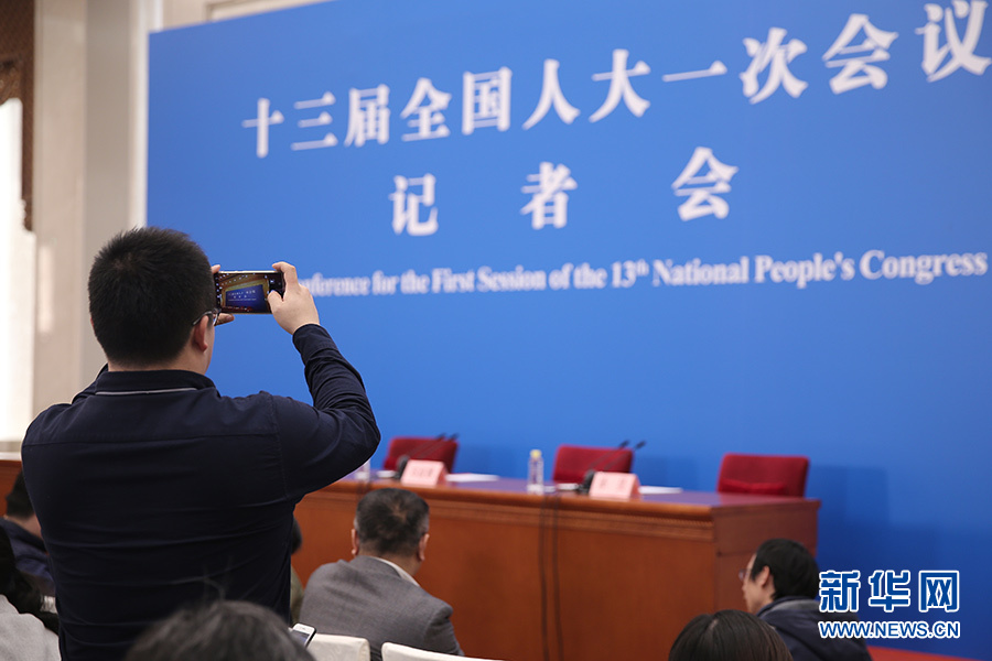 3月11日,十三屆全國人大一次會議新聞中心在人民大會堂一樓新聞發(fā)布廳舉行記者會,邀請十三屆全國人大一次會議秘書處法案組組長、全國人大常委會法工委主任沈春耀,法案組副組長、全國人大常委會法工委副主任鄭淑娜就“憲法修正案”相關(guān)問題回答中外記者提問。圖為記者會開始前記者在現(xiàn)場拍攝。新華網(wǎng)/中國政府網(wǎng)?翟子赫 攝