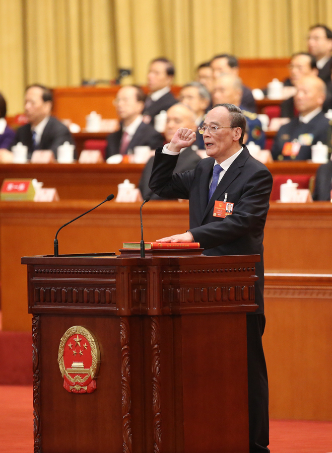 3月17日,十三屆全國(guó)人大一次會(huì)議在北京人民大會(huì)堂舉行第五次全體會(huì)議。王岐山當(dāng)選為中華人民共和國(guó)副主席。這是王岐山進(jìn)行憲法宣誓。新華社記者姚大偉攝