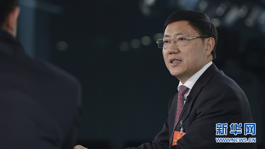 3月17日,全國(guó)人大代表,四川省巴中市委副書(shū)記、市長(zhǎng)何平(右)做客新華網(wǎng)2018全國(guó)兩會(huì)特別訪談。新華網(wǎng) 李相博攝