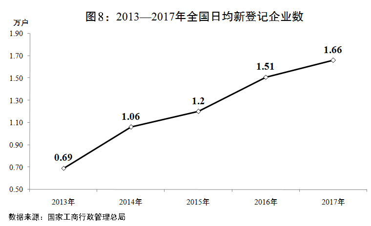 二是大眾創(chuàng)業(yè)萬眾創(chuàng)新不斷深化。《國務院關于強化實施創(chuàng)新驅(qū)動發(fā)展戰(zhàn)略進一步推進大眾創(chuàng)業(yè)萬眾創(chuàng)新深入發(fā)展的意見》(國發(fā)〔2017〕37號)印發(fā)實施。新支持92個國家雙創(chuàng)示范基地建設,建成4298家眾創(chuàng)空間、3255家科技企業(yè)孵化器和400余家企業(yè)加速器,第三屆全國雙創(chuàng)活動周及“創(chuàng)響中國”巡回接力活動成功舉辦。全年新登記企業(yè)達到607.4萬戶,增長9.9%,日均新登記企業(yè)達到1.66萬戶。
