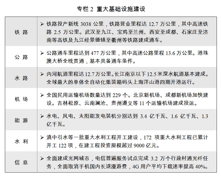 四是加強水利交通能源等基礎設施建設。今年要完成鐵路投資7320億元、公路水運投資1.8萬億元左右,水利在建投資規(guī)模達到1萬億元。再開工一批重大水利工程,加強中小河流治理、小型病險水庫除險加固等水利薄弱環(huán)節(jié)建設。加快建設北京至沈陽、商丘經(jīng)合肥至杭州、鄭州至萬州高鐵,開工建設北京至雄安、和田至若羌等鐵路。有序發(fā)展高速公路,支持普通國省干線提級改造。進一步完善通江達海、干支銜接的航道網(wǎng)絡,提高干線航道通航能力和支線航道等級。積極推進北京、成都、青島等新機場建設,推進一批樞紐機場改擴建和支線機場項目建設。支持符合條件的城市有序發(fā)展城市軌道交通。推動“互聯(lián)網(wǎng)+”便捷交通建設,提升綜合交通服務質(zhì)量。加快構建便捷高效、綠色安全骨干物流基礎設施網(wǎng)絡。落實能源生產(chǎn)和消費革命戰(zhàn)略,推進能源革命試點示范,開展非化石能源跨越發(fā)展行動,構建清潔能源消納長效機制,加快傳統(tǒng)能源清潔高效利用,加強電網(wǎng)、油氣管網(wǎng)布局優(yōu)化和互聯(lián)互通,增強天然氣供給保障能力和油氣儲備應急能力。