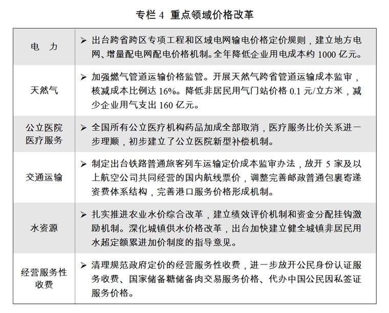 五是價格改革繼續(xù)深化。全面深化價格機制改革的意見出臺實施。持續(xù)推進能源領域價格改革,完成首輪省級電網(wǎng)輸配電價改革,降低非居民用氣基準門站價格,天然氣全產(chǎn)業(yè)鏈價格監(jiān)管制度基本建立。公立醫(yī)院藥品加成全部取消,公立醫(yī)療機構特需等醫(yī)療服務定價穩(wěn)步放開。交通運輸價格改革加快推進。水資源價格改革穩(wěn)步推進。
