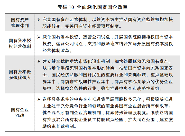 五是深化國資國企改革。完善各類國有資產(chǎn)管理體制,以管資本為主加快轉變國有資產(chǎn)監(jiān)管機構職能,改革國有資本授權經(jīng)營體制。加快國有經(jīng)濟布局優(yōu)化、結構調(diào)整、戰(zhàn)略性重組,以資本為紐帶促進各類所有制企業(yè)優(yōu)勢互補,推動國有資本做強做優(yōu)做大。積極穩(wěn)妥推進國有企業(yè)股權多元化和混合所有制改革,進一步推動重點領域混合所有制改革試點,培育具有全球競爭力的世界一流企業(yè)。深化國有林區(qū)林場、農(nóng)墾改革。