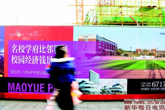 ▲1月16日,重慶渝北中央公園,一位市民抱著孩子從寫有“名校學(xué)府”字樣的房地產(chǎn)廣告前走過。在重慶,許多樓盤將中小學(xué)名校作為賣點(diǎn)進(jìn)行宣傳營銷。記者王全超攝