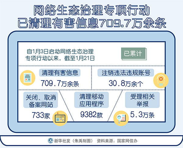 圖表:網(wǎng)絡(luò)生態(tài)治理專(zhuān)項(xiàng)行動(dòng)已清理有害信息709.7萬(wàn)余條 新華社發(fā) 朱禹 制圖