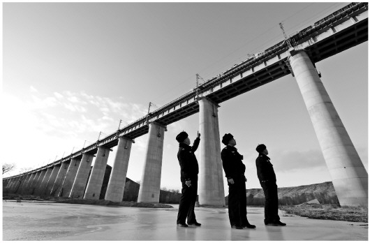 圖① 冬季瑟爾基河冰封,橋下經(jīng)常有人穿行。為防止橋上石砟因火車(chē)經(jīng)過(guò)震動(dòng)落下砸到人,民警經(jīng)常踏冰巡視。