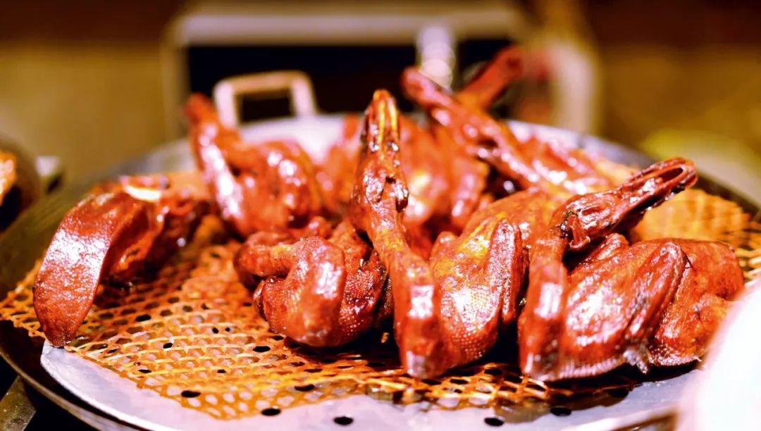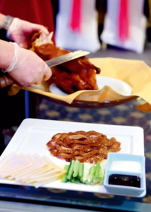 剛烤完的鴨子,一刀刀片好,皮肉分離。鴨皮蘸糖,放入口中,無須咀嚼,鴨皮入口即化,酥香悠長(zhǎng)的回味在齒間彌漫。