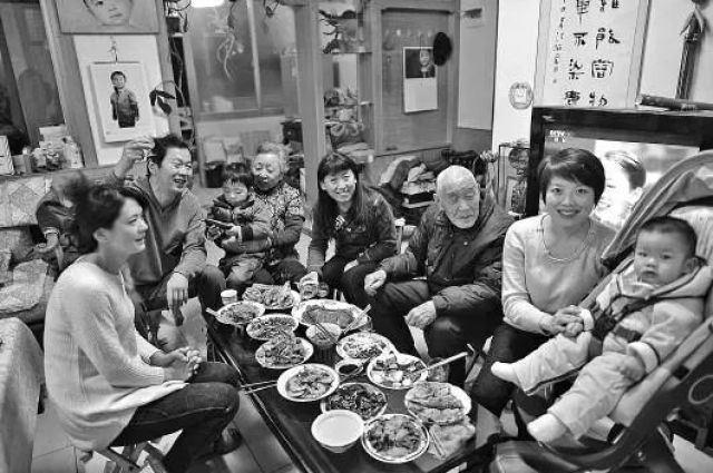 ↑1953年,天津市漢沽區(qū)蘆臺王德鑄(左一)一家吃團圓飯。