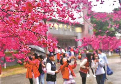 華南農(nóng)業(yè)大學內(nèi)的櫻花盛開,引來不少市民賞花拍花。記者廖雪明 攝