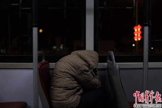 深夜1點(diǎn)的公車上,一名青年和衣蜷縮在座椅上。?鄭萍萍攝