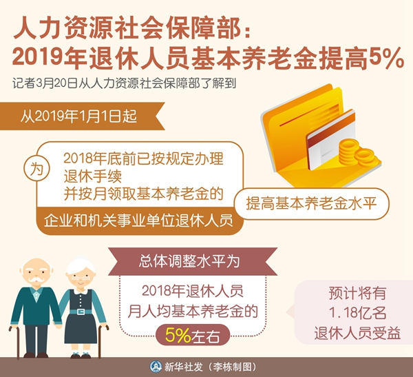 新華社北京3月20日電(記者葉昊鳴)記者20日從人力資源社會保障部了解到,從2019年1月1日起,為2018年底前已按規(guī)定辦理退休手續(xù)并按月領(lǐng)取基本養(yǎng)老金的企業(yè)和機(jī)關(guān)事業(yè)單位退休人員提高基本養(yǎng)老金水平,總體調(diào)整水平為2018年退休人員月人均基本養(yǎng)老金的5%左右,預(yù)計(jì)將有1.18億名退休人員受益。