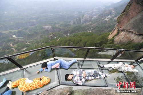 資料圖:2017年3月21日,正值世界睡眠日,游人身著卡通睡衣躺在湖南平江石牛寨的懸崖玻璃棧道上,擺出各種睡姿享受睡眠,以此行為藝術(shù)呼吁關(guān)注睡眠健康。 楊華峰 攝