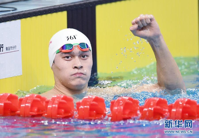 3月30日,浙江隊選手孫楊在男子1500米自由泳預賽后慶祝,他以15分14秒21的成績排名預賽第一,并晉級決賽。當日,在山東省青島市舉行的2019年全國游泳冠軍賽暨世錦賽選拔賽進入第七個比賽日。 新華社記者李紫恒攝