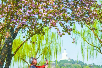 近日,北海公園西岸三十多年樹齡的西府海棠花開正盛,綠肥紅瘦吸引市民前來(lái)觀賞。本報(bào)記者 鄧偉攝
