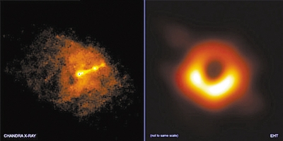 左圖 錢德拉X射線望遠(yuǎn)鏡與事件視界望遠(yuǎn)鏡同時(shí)拍攝的照片,顯示了M87星系中心黑洞的“相對(duì)論性噴流”。右圖 事件視界望遠(yuǎn)鏡拍攝的M87星系中心黑洞圖像。圖片來源:美國趣味科學(xué)網(wǎng)站