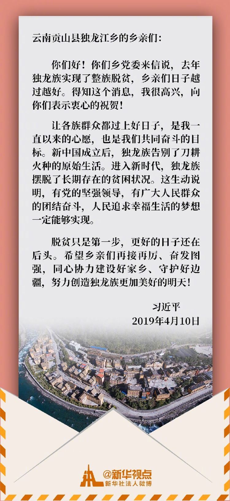 這一天,習近平總書記給他們回信??倳浽谛胖凶YR獨龍族實現(xiàn)整族脫貧,勉勵鄉(xiāng)親們?yōu)檫^上更加幸福美好的生活繼續(xù)團結(jié)奮斗。