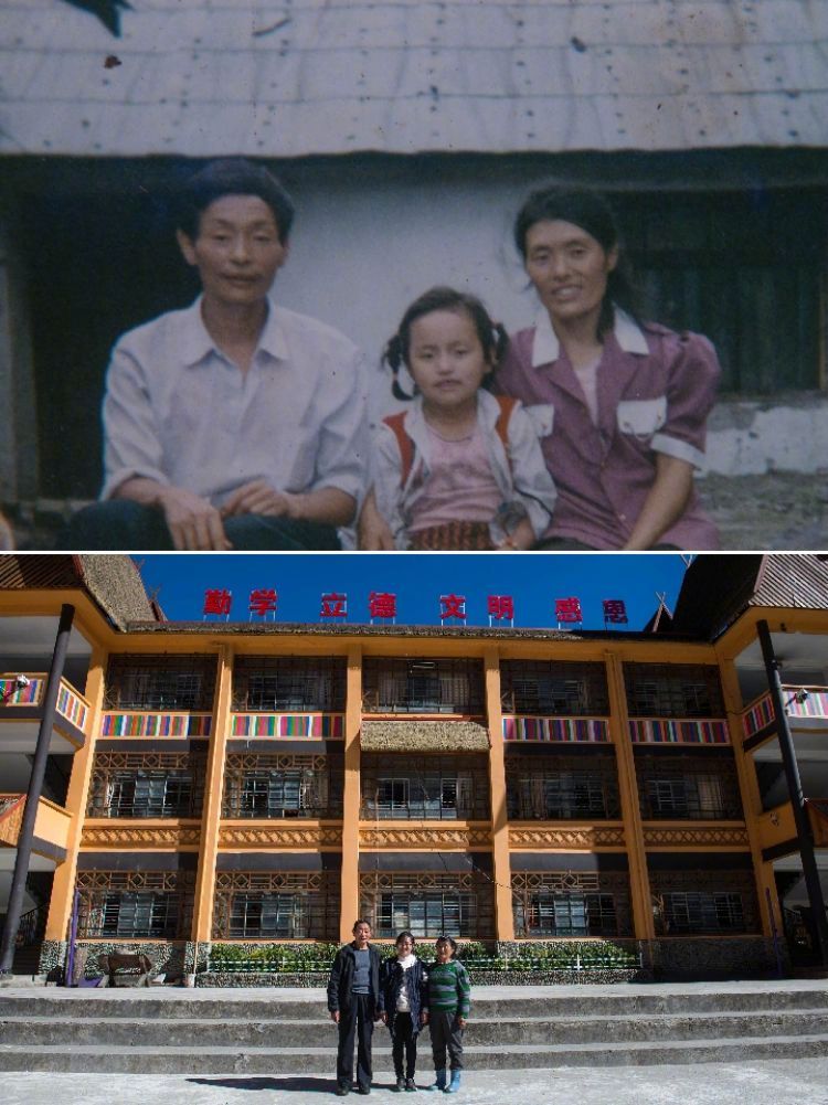 拼版照片,上圖:1993年在獨龍江鄉(xiāng)小學拍攝的獨龍族群眾高德生、高瓊先和黎英(從左到右)一家三口(資料照片);下圖:2016年11月23日在獨龍江鄉(xiāng)中心小學拍攝的獨龍族群眾高德生、高瓊先和黎英一家(從左到右)