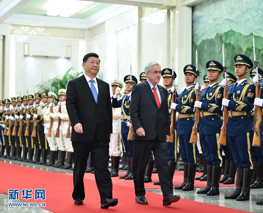 會談前,習近平在人民大會堂北大廳為皮涅拉舉行歡迎儀式。彭麗媛、丁薛祥、楊潔篪、白瑪赤林、王毅、劉奇葆、何立峰等參加。