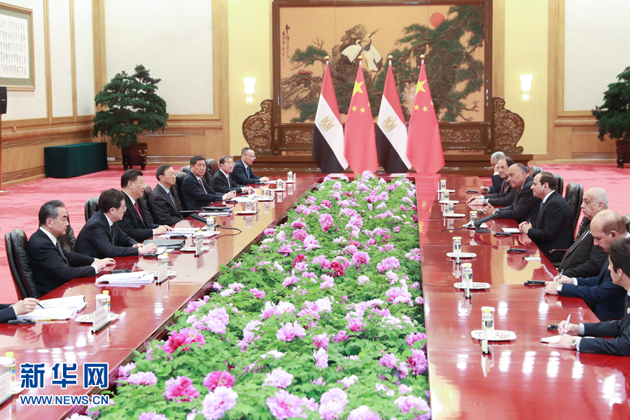 習近平強調(diào),埃及是非洲聯(lián)盟輪值主席國,總統(tǒng)先生來華出席第二屆“一帶一路”國際合作高峰論壇,不僅體現(xiàn)了埃及積極參與共建“一帶一路”的真誠意愿,也代表著非洲國家尋求互利共贏、實現(xiàn)共同發(fā)展的普遍呼聲。中方高度重視發(fā)展同埃及關(guān)系。雙方要深化政治互信,繼續(xù)在涉及彼此核心利益和重大關(guān)切問題上相互支持和配合。中方始終支持埃及探索符合本國國情的發(fā)展道路,愿積極參與蘇伊士運河走廊開發(fā)計劃,持續(xù)推進蘇伊士經(jīng)貿(mào)合作區(qū)建設(shè)及產(chǎn)能、基礎(chǔ)設(shè)施建設(shè)等領(lǐng)域合作。中方還將在埃及設(shè)立“魯班工坊”,向埃及青年提供職業(yè)技能培訓。雙方要深化反恐和安全合作,持續(xù)密切人文交流。中國感謝非洲人民對中國的信任,我們支持非洲和平安全與可持續(xù)發(fā)展倡議和非洲一體化進程,愿同埃方加強對非三方合作,共同促進非洲基礎(chǔ)設(shè)施建設(shè)。