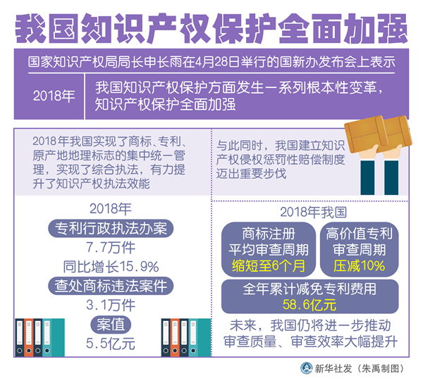 新華社北京4月28日電(記者張泉)國家知識產(chǎn)權(quán)局局長申長雨在28日舉行的國新辦發(fā)布會上表示,2018年,我國知識產(chǎn)權(quán)保護(hù)方面發(fā)生一系列根本性變革,知識產(chǎn)權(quán)保護(hù)全面加強。