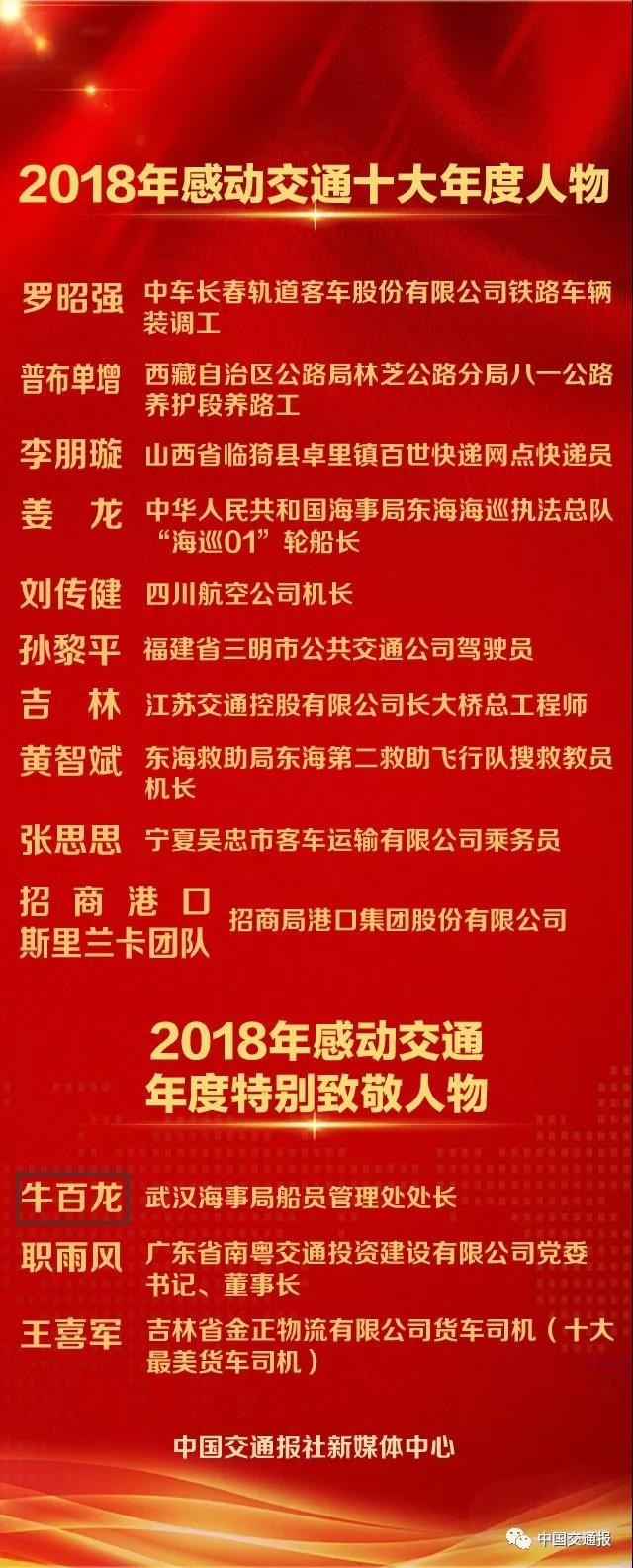 另外,將青春和生命奉獻(xiàn)給海事交通事業(yè)的武漢海事局船員管理處處長(zhǎng)牛百龍;胸懷大愛,積極踐行“大道為公”理念的廣東南粵交通投資建設(shè)有限公司黨委書記、董事長(zhǎng)職雨風(fēng);400萬(wàn)公里安全駕駛、細(xì)心工作、熱心助人的吉林省物流貨車司機(jī)王喜軍榮獲“2018年感動(dòng)交通年度特別致敬人物”稱號(hào)。