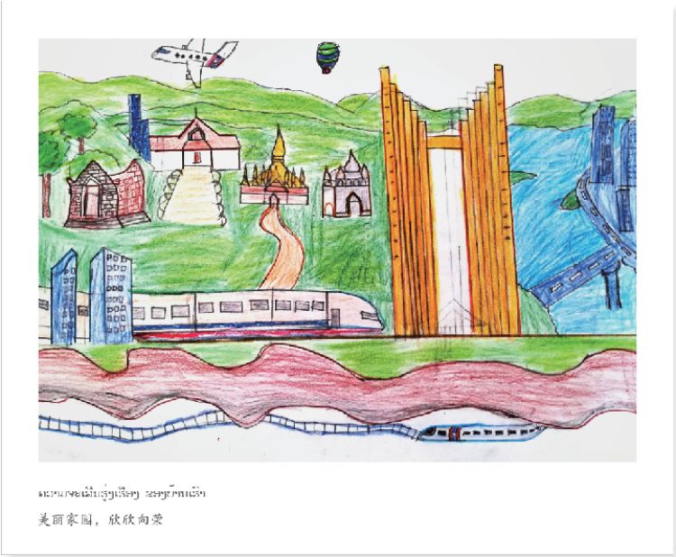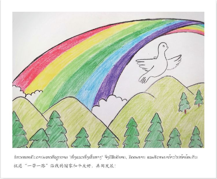 ↑中老友好農(nóng)冰村小學(xué)的學(xué)生畫(huà)作(中共中央對(duì)外聯(lián)絡(luò)部提供)