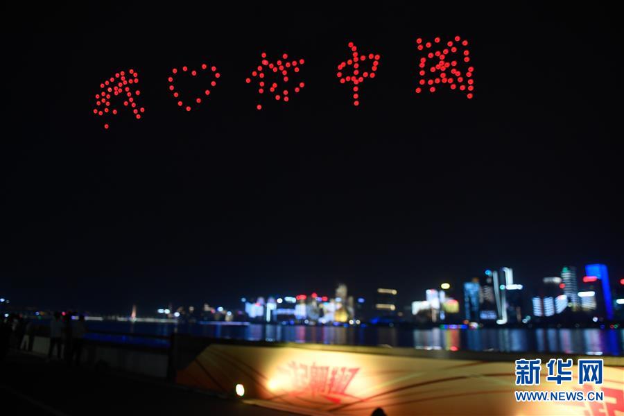 5月20日,約150架無人機空中編隊在錢塘江上空組成“我愛你中國”字樣。 當(dāng)晚,在浙江杭州錢塘江畔,城市燈光秀和約150架無人機組成的空中編隊表演交相輝映?!?20中國”“我愛你中國”“70年”……對祖國進行的一場“深情告白”閃耀錢塘兩岸。 新華社記者黃宗治攝