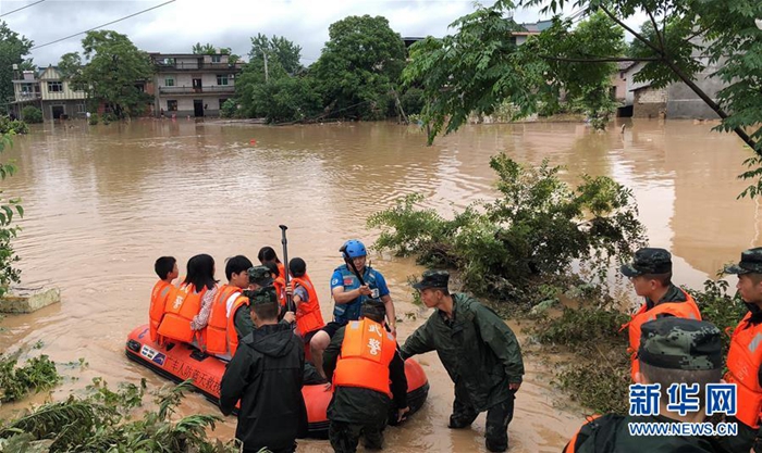 6月7日,武警江西省總隊上饒支隊官兵在玉山縣六都鄉(xiāng)六都村轉移被洪水圍困的群眾。新華社發(fā)(吳展 攝)