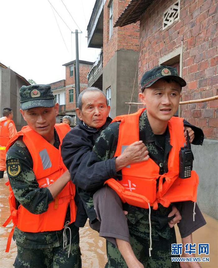 6月7日,武警江西省總隊上饒支隊官兵在玉山縣下鎮(zhèn)鎮(zhèn)白橋村轉移被洪水圍困的老人。新華社發(fā)(吳展 攝)
