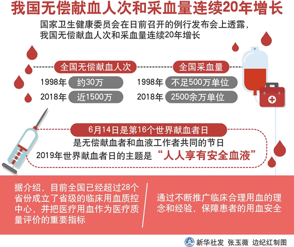 新華社北京6月11日電(記者屈婷)國家衛(wèi)生健康委員會在日前召開的例行發(fā)布會上透露,我國無償獻(xiàn)血人次和采血量連續(xù)20年增長,2018年無償獻(xiàn)血人次接近1500萬,采血量達(dá)到了2500萬單位。