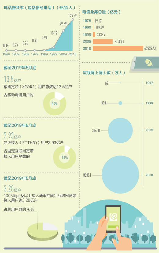 從單一種類到多種通信方式并存。2018年,我國電話普及率(包括移動電話)為125.29部/百人,固定互聯(lián)網(wǎng)寬帶接入用戶40738萬戶,移動寬帶用戶130565萬戶,互聯(lián)網(wǎng)上網(wǎng)人數(shù)從1997年的62萬人迅速上升至82851萬人。用得上、用得起、用得好的信息服務(wù)正在惠及更多百姓,億萬人民在共享互聯(lián)網(wǎng)發(fā)展成果上擁有更多獲得感、幸福感和安全感。