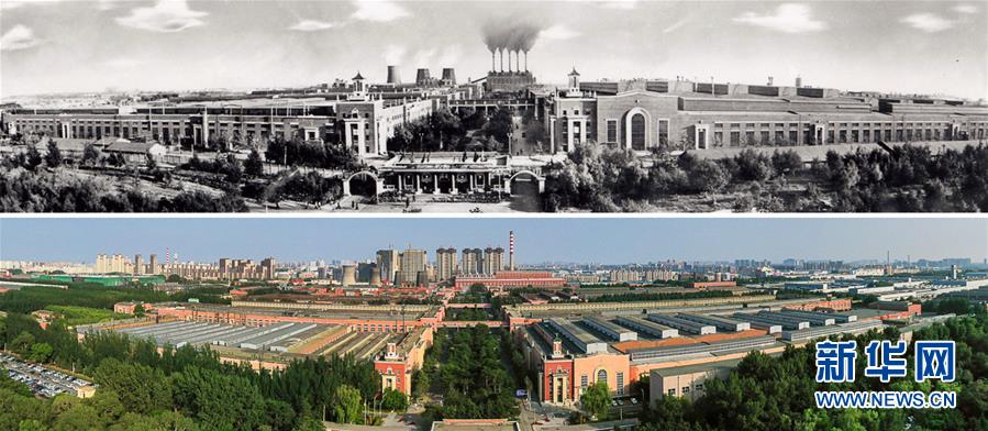 拼版照片:上圖為20世紀50年代的第一汽車制造廠廠區(qū)(資料圖片);下圖為2019年6月12日無人機拍攝的一汽廠區(qū)全景(新華社記者 許暢 攝)。新華社發(fā)