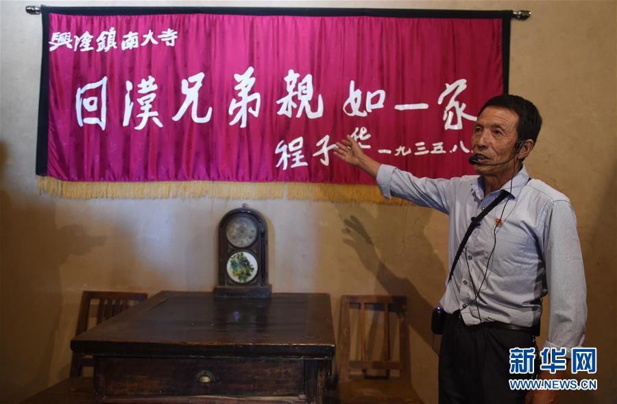 在寧夏西吉縣單家集村,西吉縣單南村黨支部書(shū)記單云在介紹“回漢兄弟親如一家”的錦匾(復(fù)制品)(8月11日攝)。新華社記者 羅曉光 攝