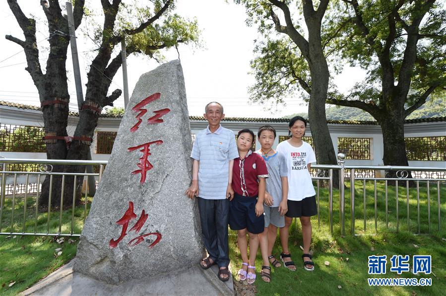 在湖北省石首市桃花山紅軍樹(shù)革命烈士紀(jì)念園,67歲的守樹(shù)人劉克樹(shù)在“紅軍樹(shù)”前與他的孫輩合影(8月1日攝)。新華社記者 羅曉光 攝