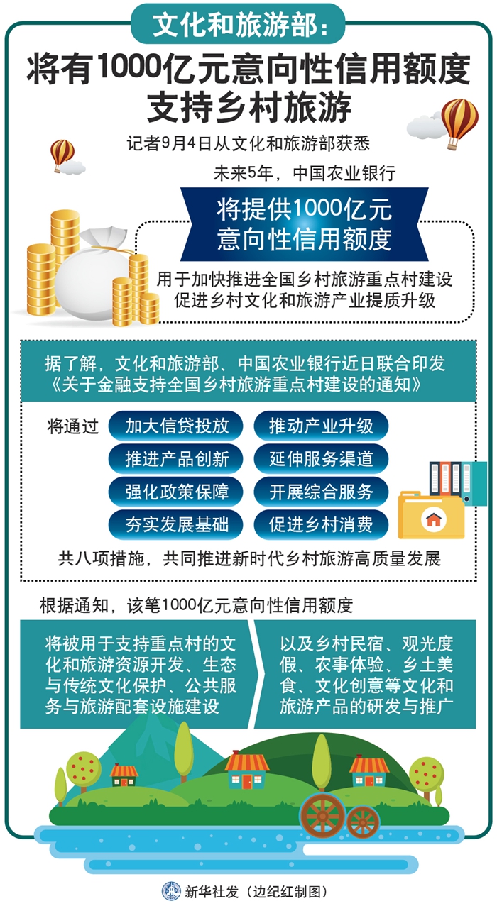 新華社北京9月4日電(記者余俊杰)記者4日從文化和旅游部獲悉,未來(lái)5年,中國(guó)農(nóng)業(yè)銀行將提供1000億元意向性信用額度,用于加快推進(jìn)全國(guó)鄉(xiāng)村旅游重點(diǎn)村建設(shè),促進(jìn)鄉(xiāng)村文化和旅游產(chǎn)業(yè)提質(zhì)升級(jí)。