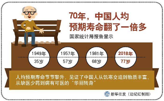 國(guó)家統(tǒng)計(jì)局報(bào)告顯示,1949年35歲,1957年57歲,1981年68歲,2018年77歲——人均預(yù)期壽命節(jié)節(jié)攀升,見(jiàn)證了中國(guó)人從饑寒交迫到物質(zhì)豐富、從缺醫(yī)少藥到病有可醫(yī)的“華麗轉(zhuǎn)身”——