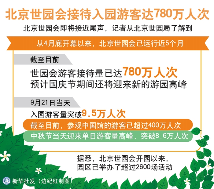 新華社北京9月23日電(魏夢(mèng)佳、王雪純)北京世園會(huì)即將接近尾聲,記者從北京世園局了解到,從4月底開(kāi)幕以來(lái),北京世園會(huì)已運(yùn)行近5個(gè)月,截至目前,世園會(huì)游客接待量已達(dá)780萬(wàn)人次,預(yù)計(jì)國(guó)慶節(jié)期間還將迎來(lái)新的游園高峰。