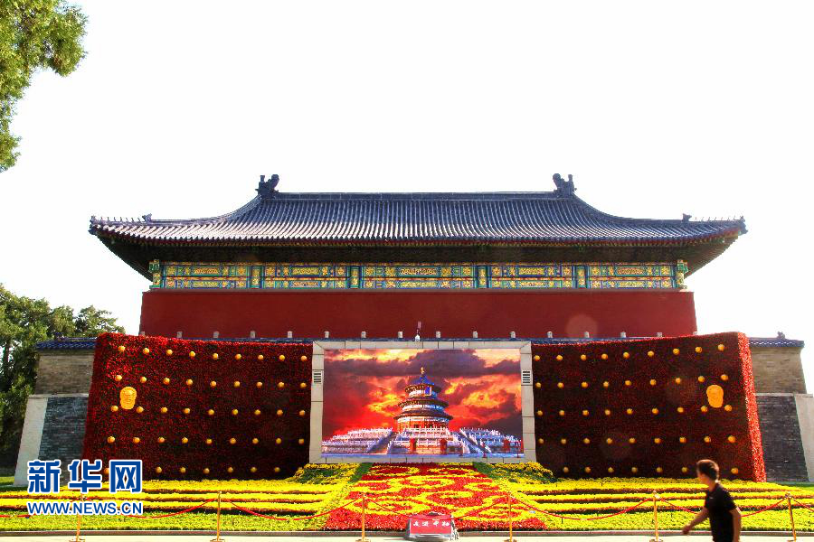 游人從北京天壇公園的立體花壇前走過(guò)(9月26日攝)。新華社發(fā)